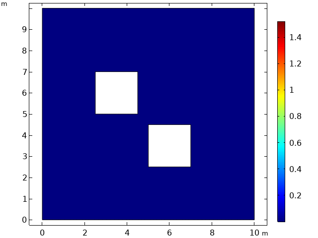 Computational fluid dynamics simulation of the velocity field over two square obstacles.